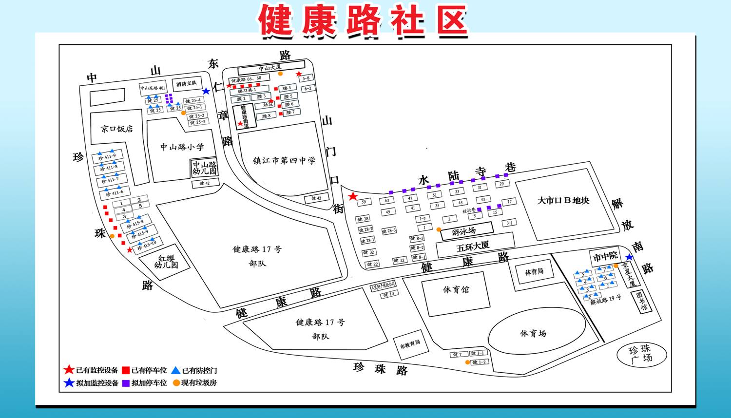健康路街道东至桃花山庄,南临正东路、京口路,西沿古运河,北依中山东路、花山路。总面积5.4平方公里。辖12个社区。辖区内共分为60个物业覆盖区域,其中封闭小区为7个面积约15万平方米,可封闭小区为15个面积约33万平方米,其余均为零散片区38个。