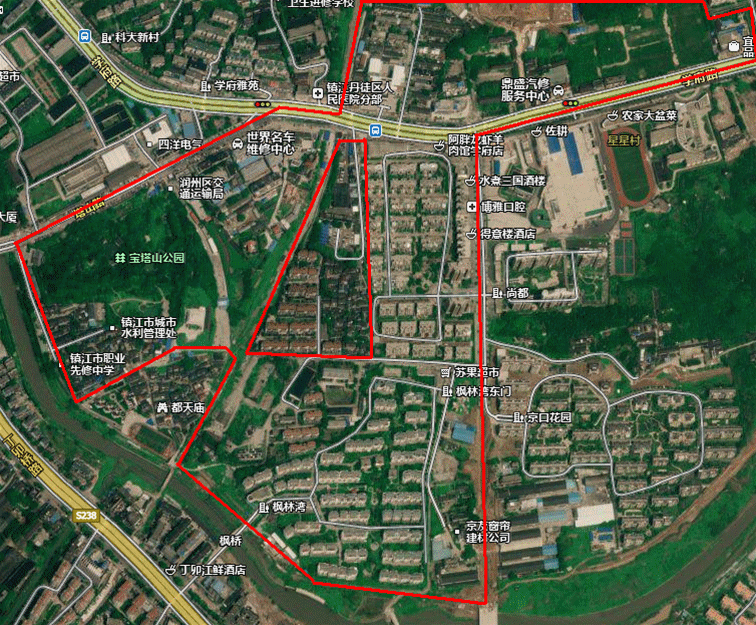 正东路街道宝塔山社区西至宝塔山公园,东至教顶山,北至戴家湾,南至古运河,占地面积约为0.3平方公里。