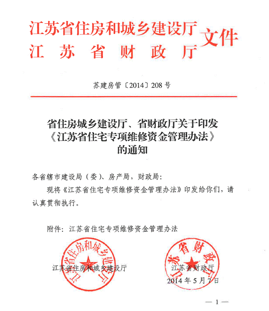 省住房城乡建设厅、省财政厅关于印发《江苏省住宅专项维修资金管理办法》的通知(苏建房管【2014】208号)